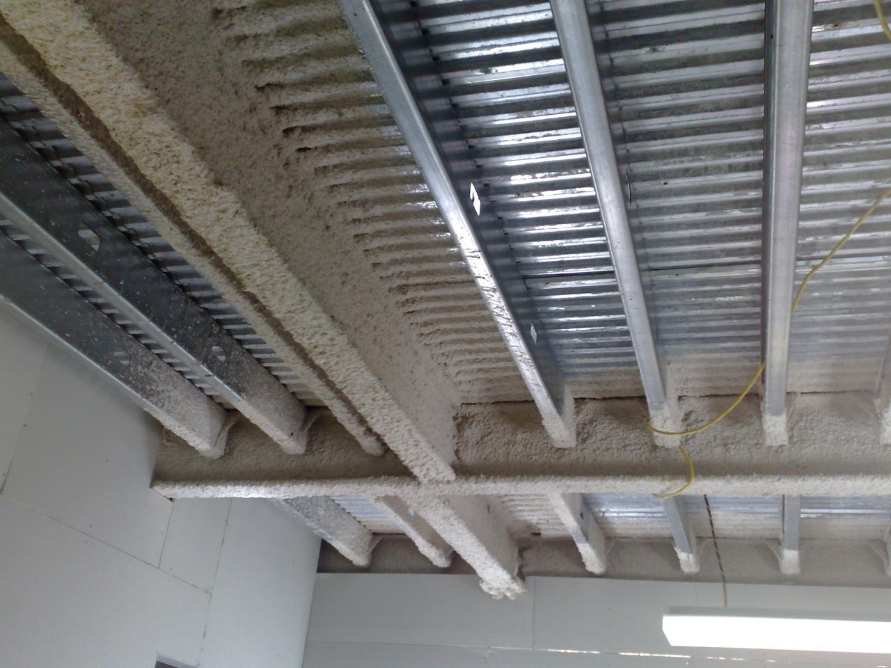 Mortero de Lana de Roca aplicado sobre Cubierta, Cerchas y Vigas de nave de estructura metálica.