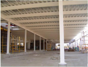 Pintura Intumescente, color amarillo, aplicada sobre vigas y pilares de estructura metálica.